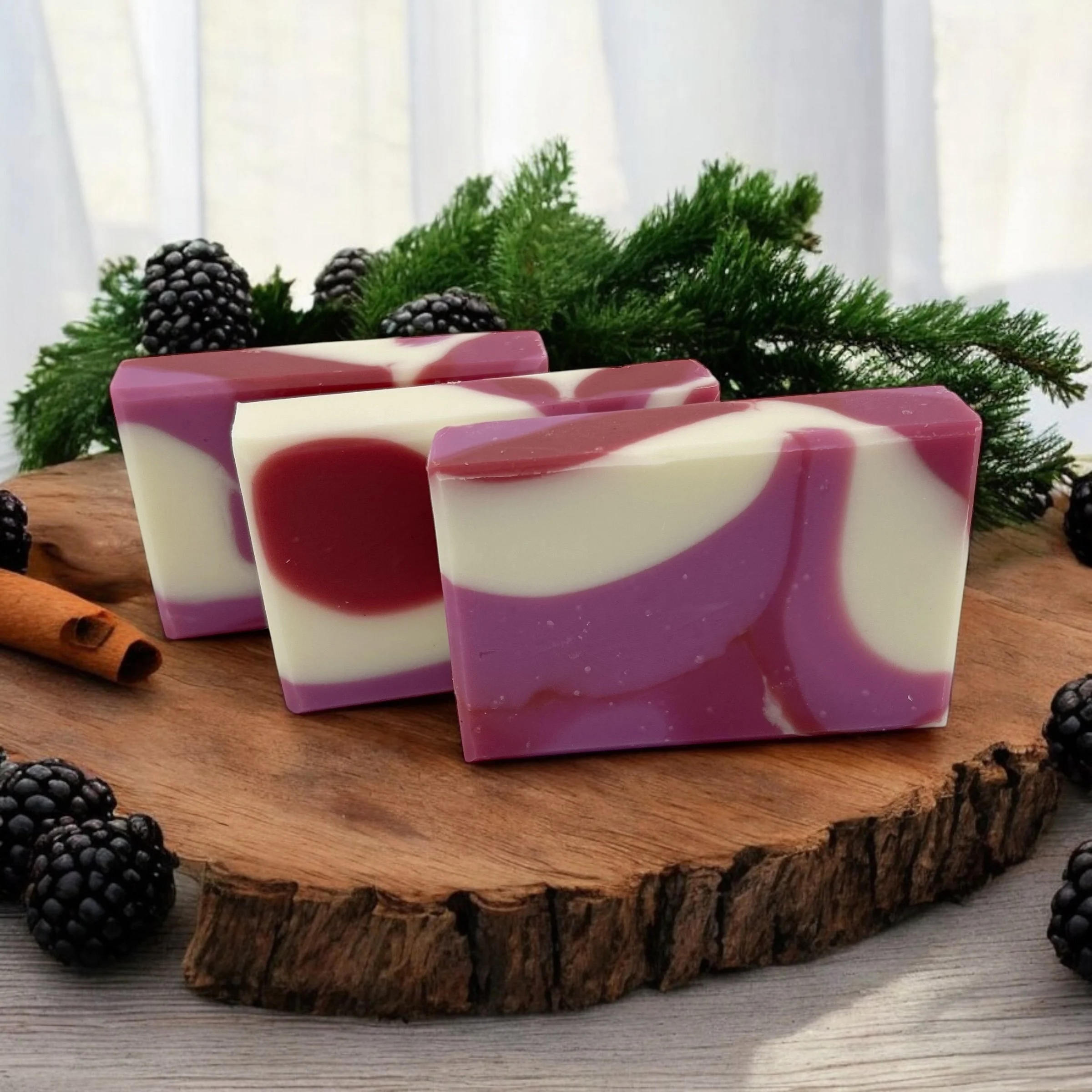 Merry Berry Soap Bar is a cheerful & festive blend of wild blackberry, fir balsam, cinnamon and lemon peel.